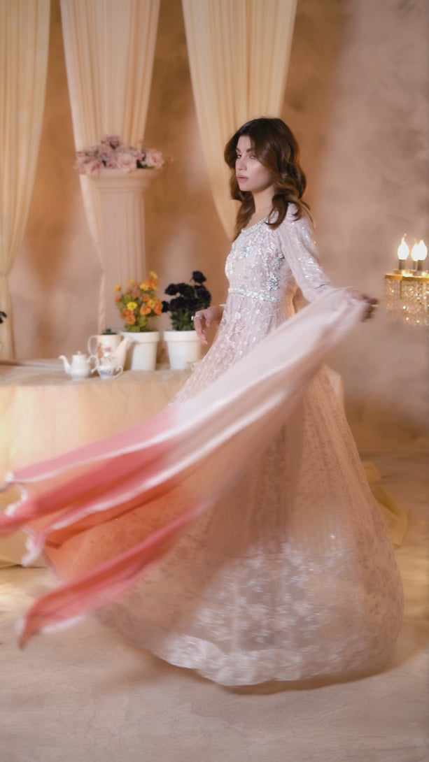 The serene pastel blue hue elegantly serves as an ideal backdrop for this celebratory ensemble, meticulously crafted from luxurious pure raw silk fabric adorned with exquisite cutwork. The ensemble is further elevated with sophisticated thread embroidery, culminating in a graceful finish with a floral border. Paired with a two-toned pure silk dupatta.