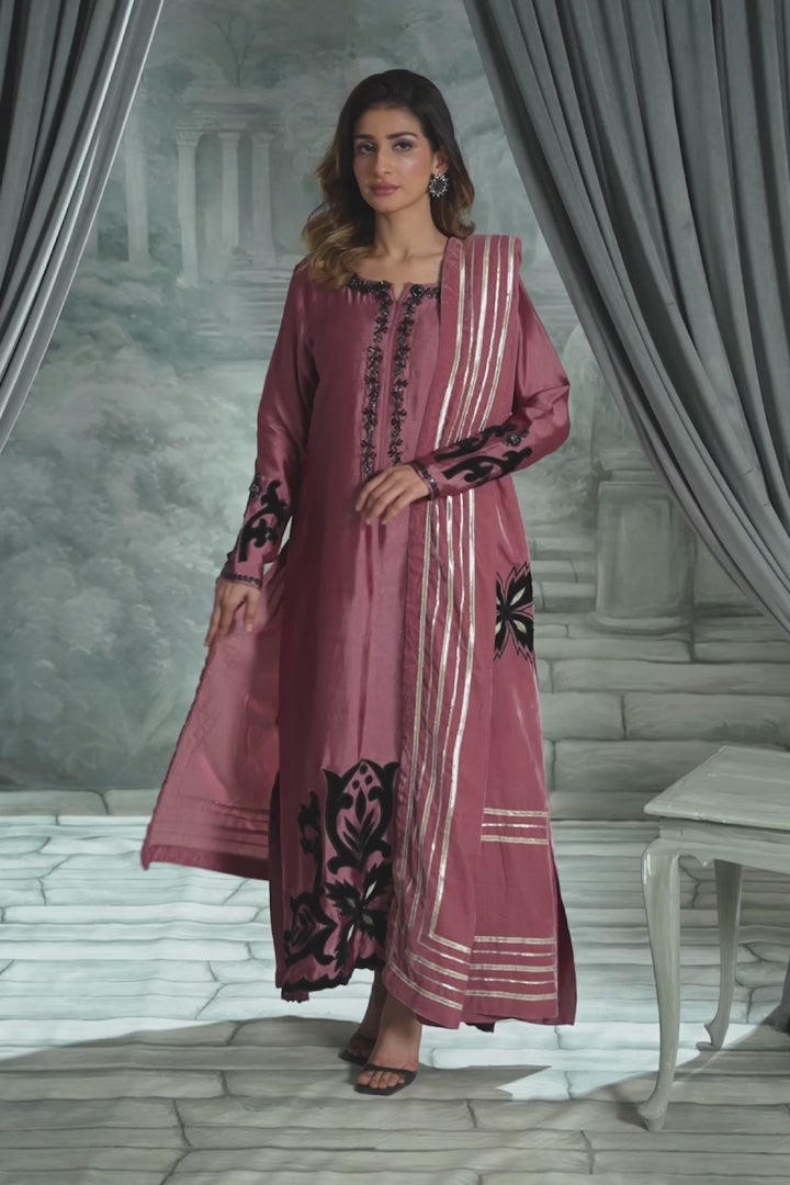 Indulge in the soft elegance of pure Shisha Silk in a delicate Tea Pink hue. This stunning set is paired with a breathtaking Velvet Chaddar that exudes opulence. The shawl is a masterpiece, adorned with intricate velvet applique work, sparkling Cut Dana, brilliant crystals, and exquisite stone work.