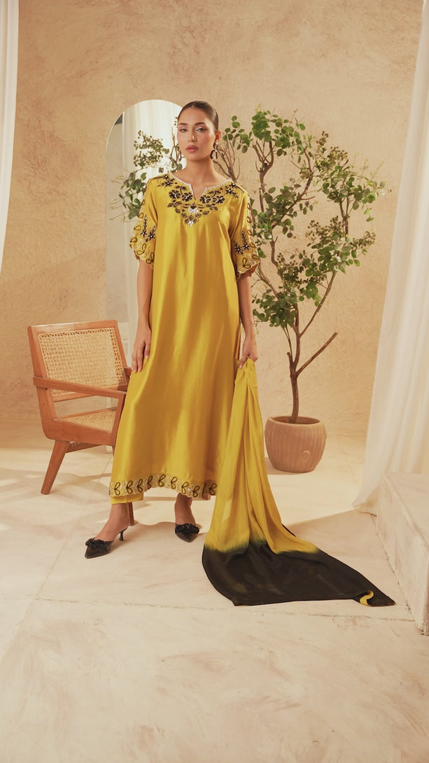 Mustard dreams come to life! Crafted from the finest pure shisha silk, this mustard dress is a canvas of intricate handwork. Appliques, shimmering sequins, and luminous pearls adorn the fabric, creating a look that’s both opulent and refined. Complemented by a beautiful, shaded dupatta and classic pants, this piece is made for your most special moments. Lining included