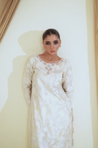 Radiate charm in this ivory and peach ensemble, featuring a luxurious base of floral thread and sequins embroidery. The shirt is meticulously elevated with exquisite handwork of crystals, delicate floral threadwork, and intricate cutwork detailing along the neckline and hem. Paired with flowing wide-leg pants and a soft dual-toned dupatta, this look is a masterclass in ethereal, handcrafted luxury for any festive occasion.