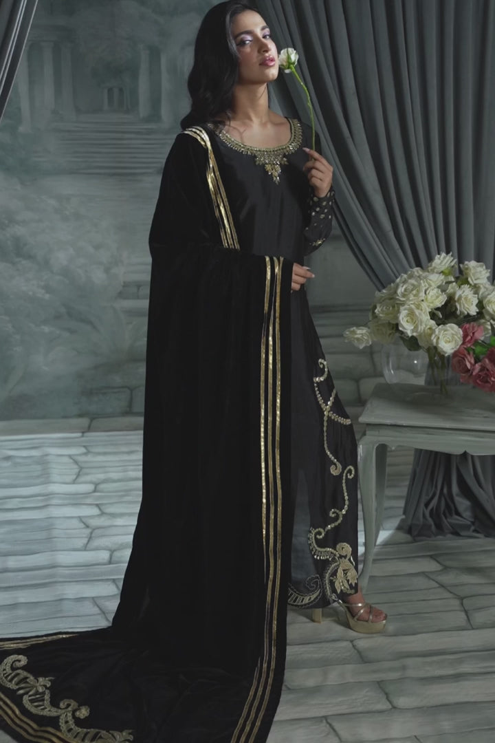 This elegant ensemble features a deep black pure sheesha silk shirt with brilliant sequins and crystal sparkle. It's paired with a lavish velvet chaddar showcasing beautiful velvet applique and traditional Gotta work. Pure luxury for your next grand event!