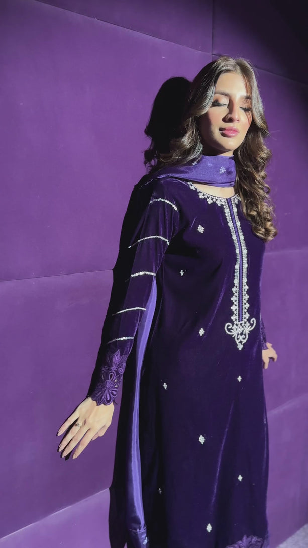 This enchanting ensemble, in a captivating shade of blue, is fashioned from luxurious raw silk, evoking a sense of sartorial poetry. Its design showcases a breathtaking shirt adorned with intricate stone detailing and exquisitely handcrafted embellishments, a testament to the artistry of our skilled artisans. Paired gracefully with an opulent velvet shawl featuring stunning gotta work, this piece embodies a rich tapestry of aesthetics and flamboyant design.