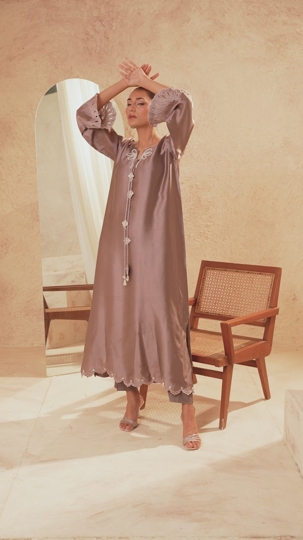 Wrapped in muted brownish-grey pure shisha silk, this piece is a canvas of craftsmanship. Hand worked detailing, floral cutwork, sequins, and crystal-studded pearls create a luminous interplay of texture and light. An ensemble designed to enchant with its refined opulence and glamour.