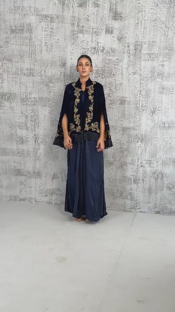 This blue beauty is a classic piece, Maya features a gorgeous Velvet cape adorned with dainty pearls, elegant crystal stones, splendid kora work enriched with fringes to complete the ethereal...