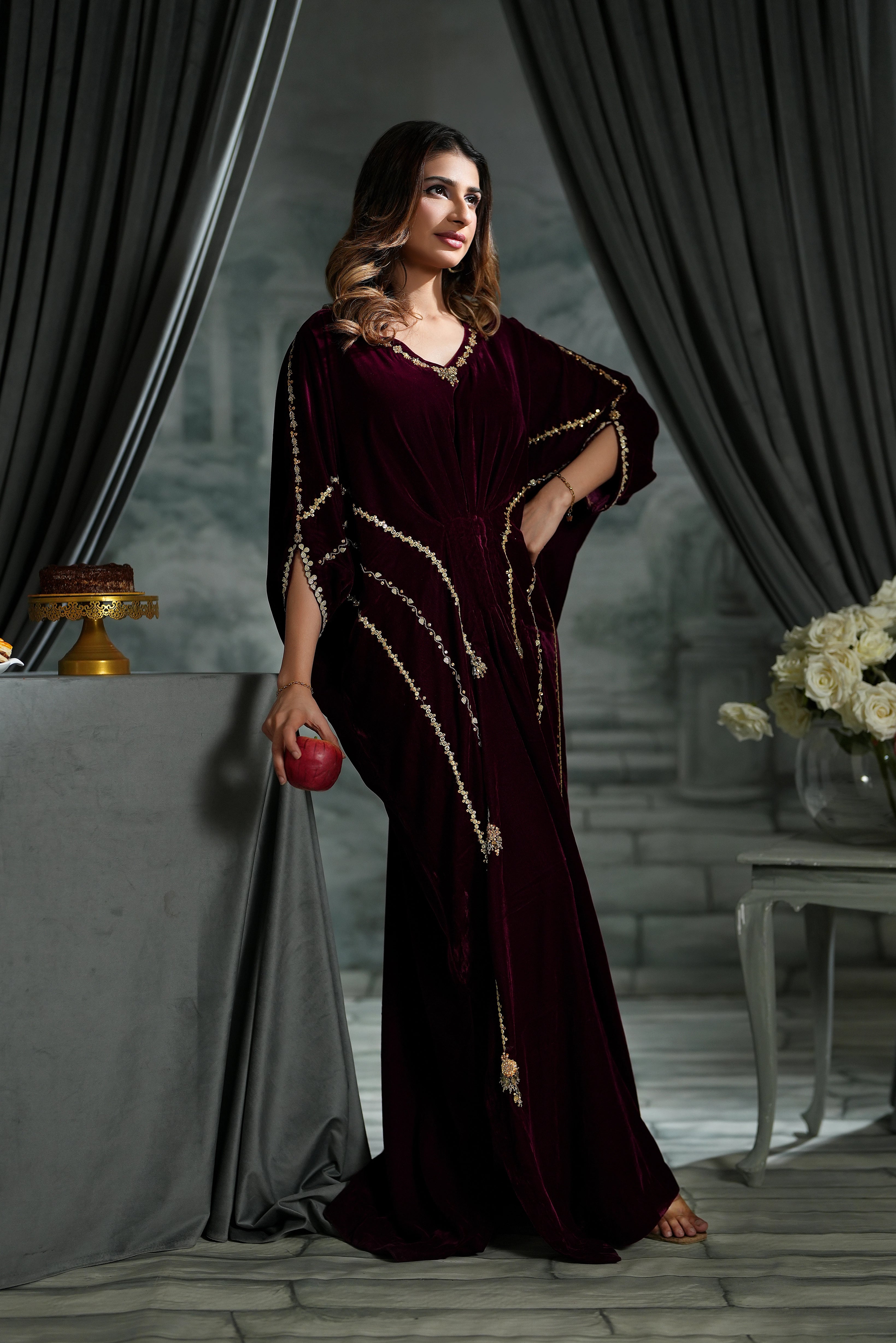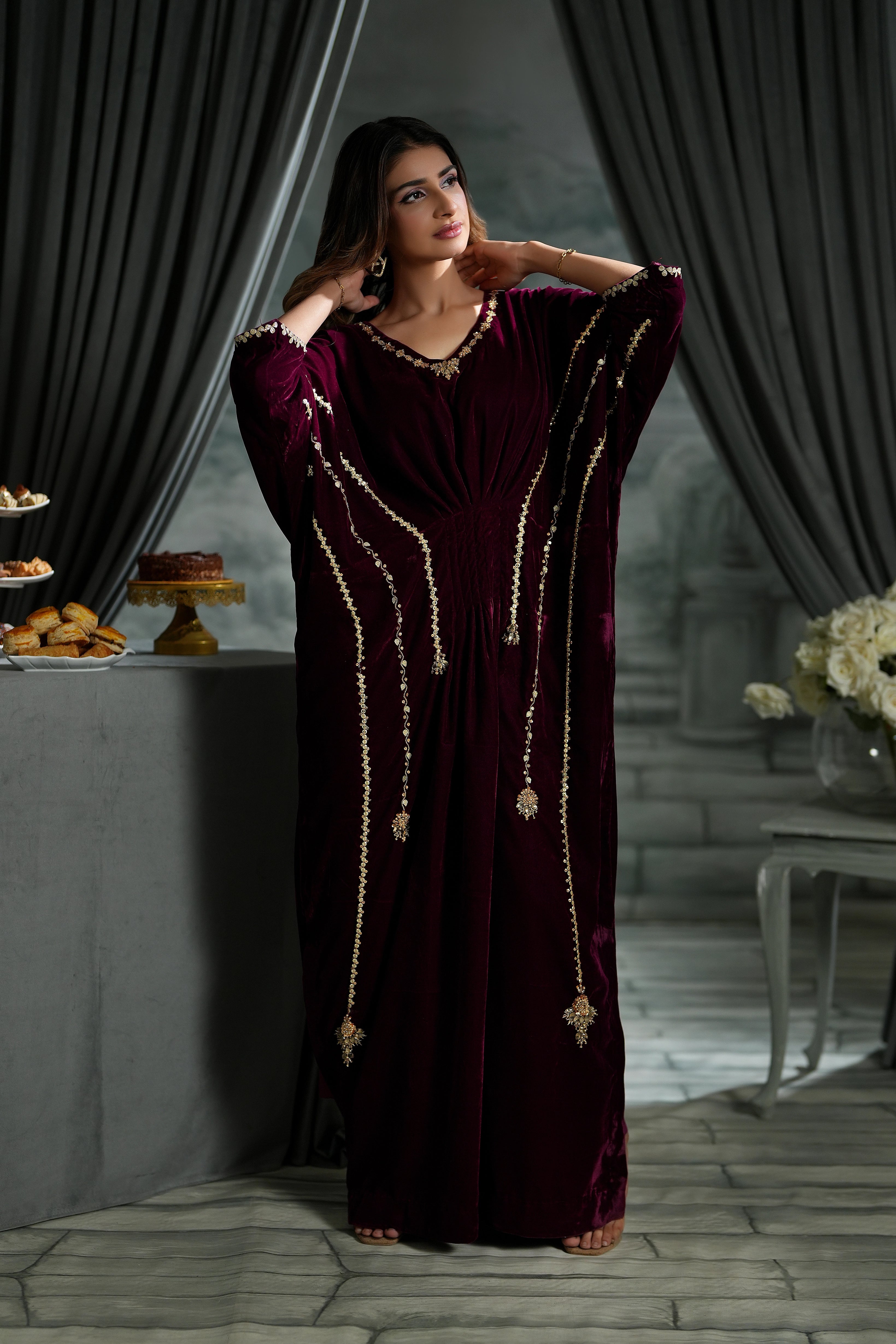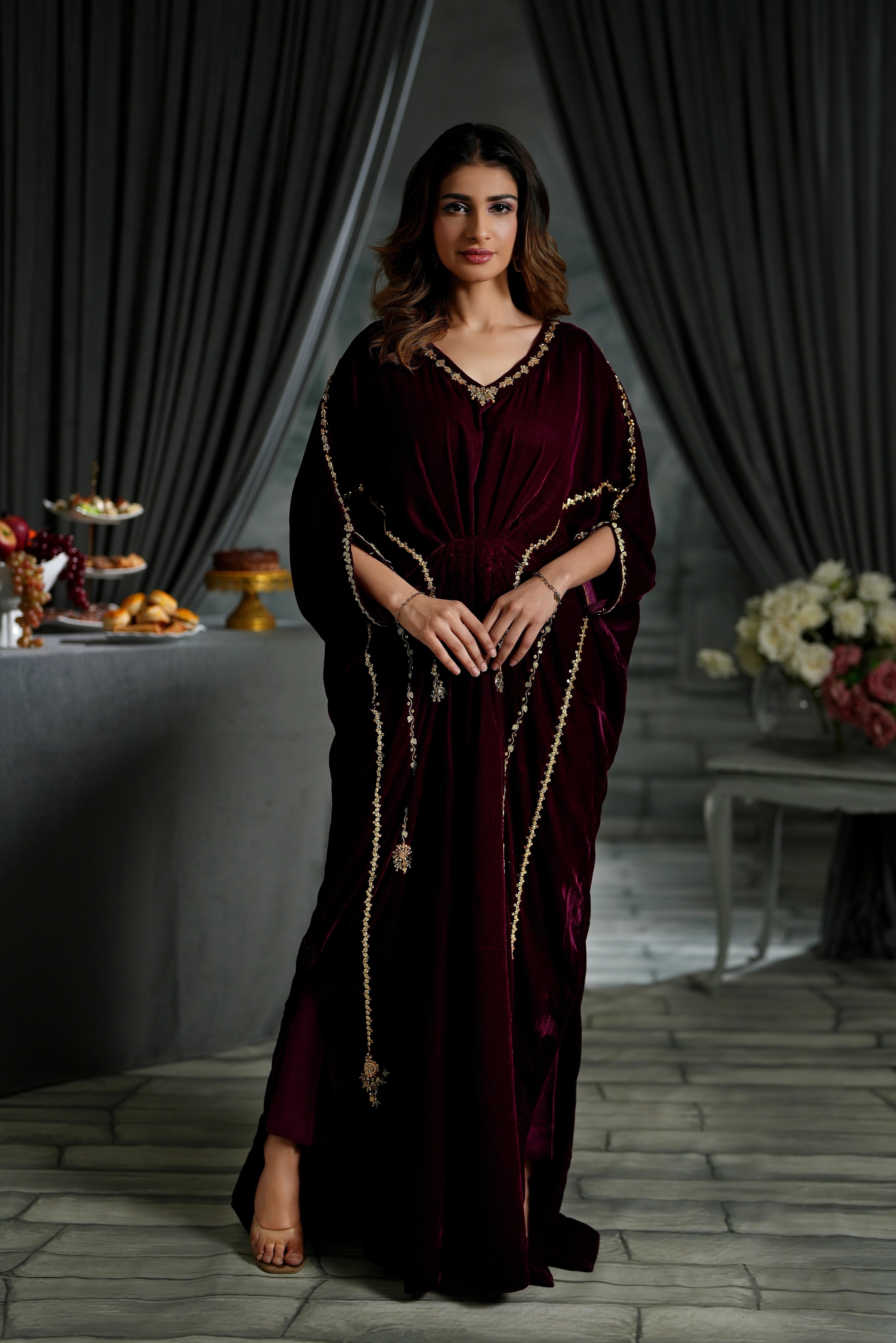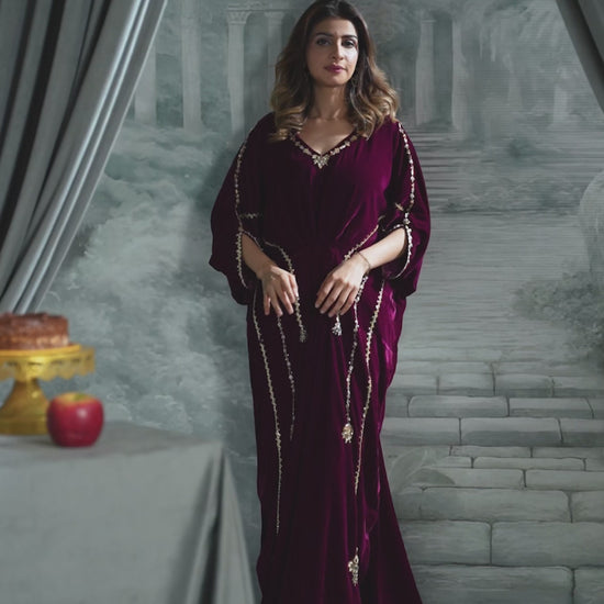 Get ready to turn heads in our sensational velvet kaftan! The rich maroon hue and butter-soft fabric set the stage, while the intricate sequins and gotta work and sparkling crystal stone neckline steal the show.