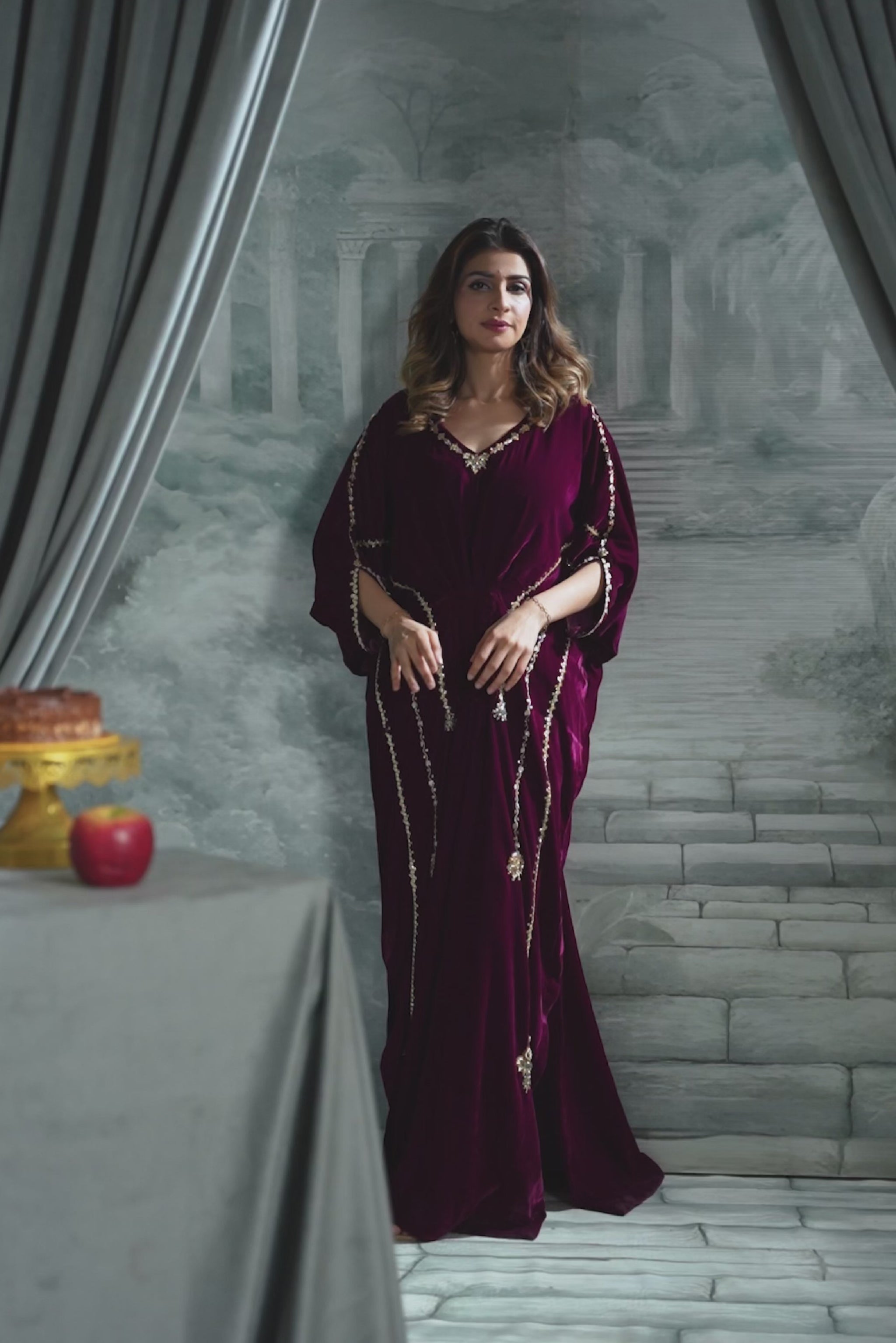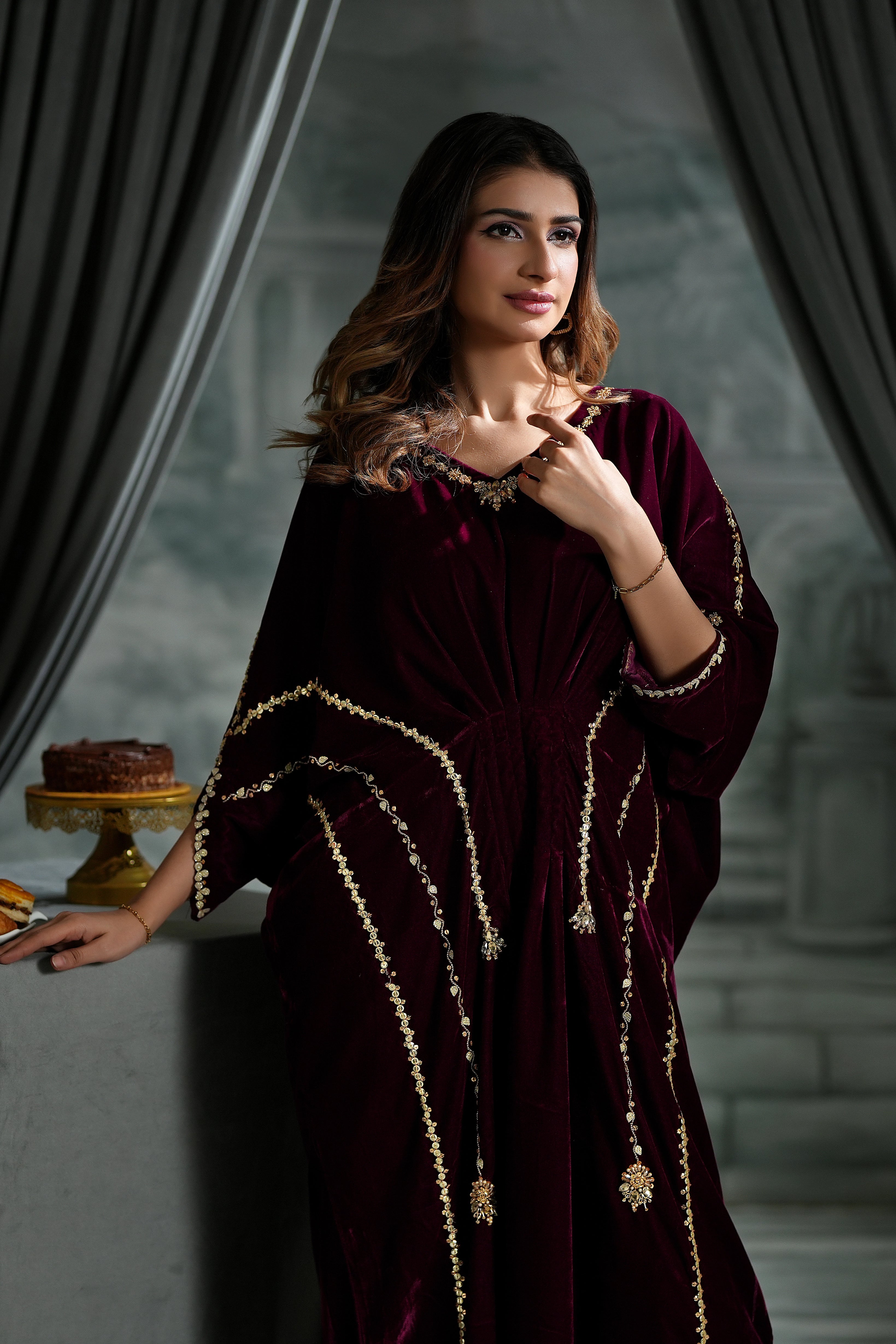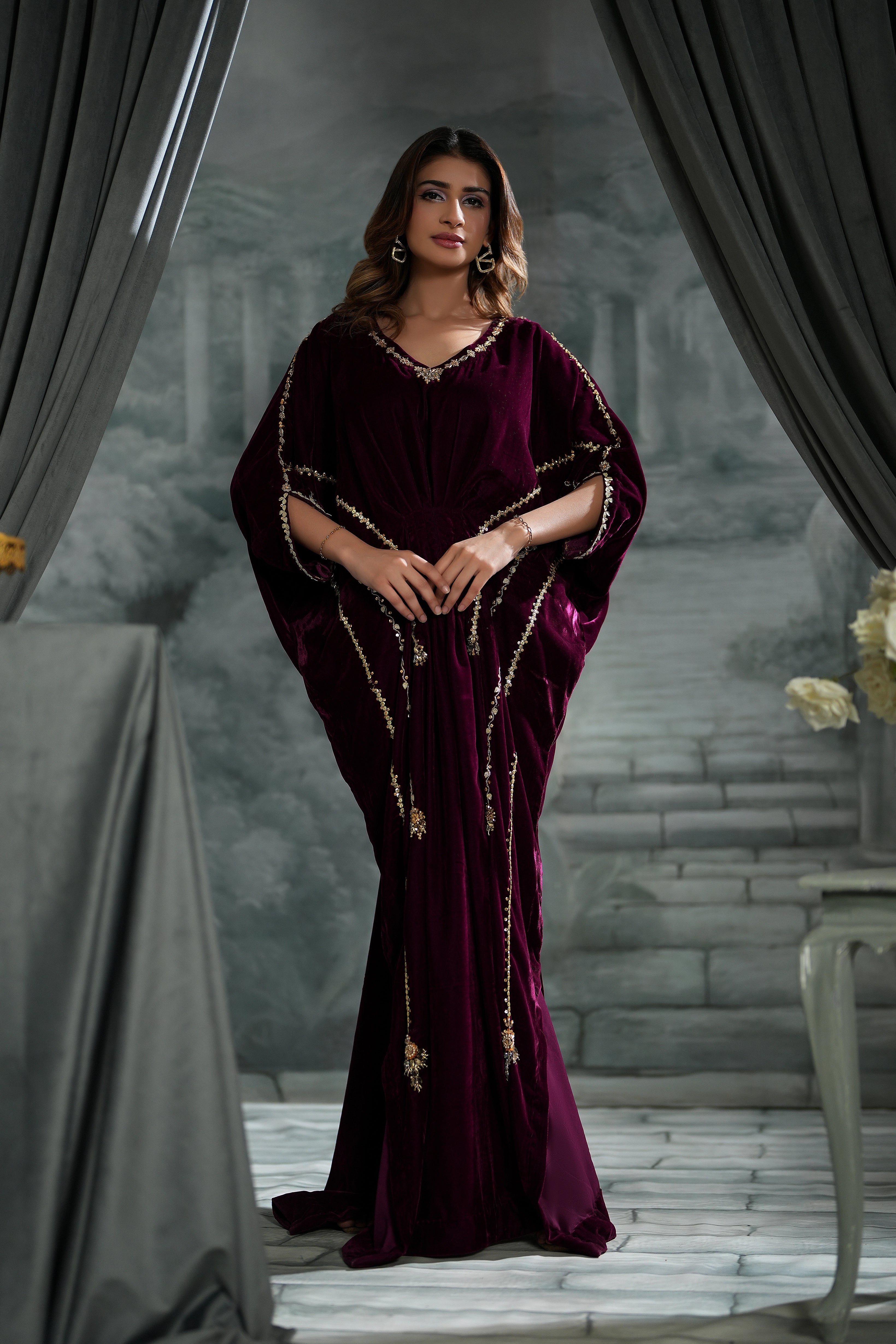 Get ready to turn heads in our sensational velvet kaftan! The rich maroon hue and butter-soft fabric set the stage, while the intricate sequins and gotta work and sparkling crystal stone neckline steal the show.