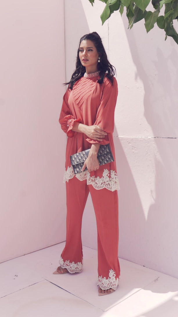 Spruce up your wardrobe with our stunning silky flowy shirt, graced with gorgeous floral details on the shirt and pants, further complemented with hand-made pearls. Colour: Orange Fabric: Shirt: Silk...