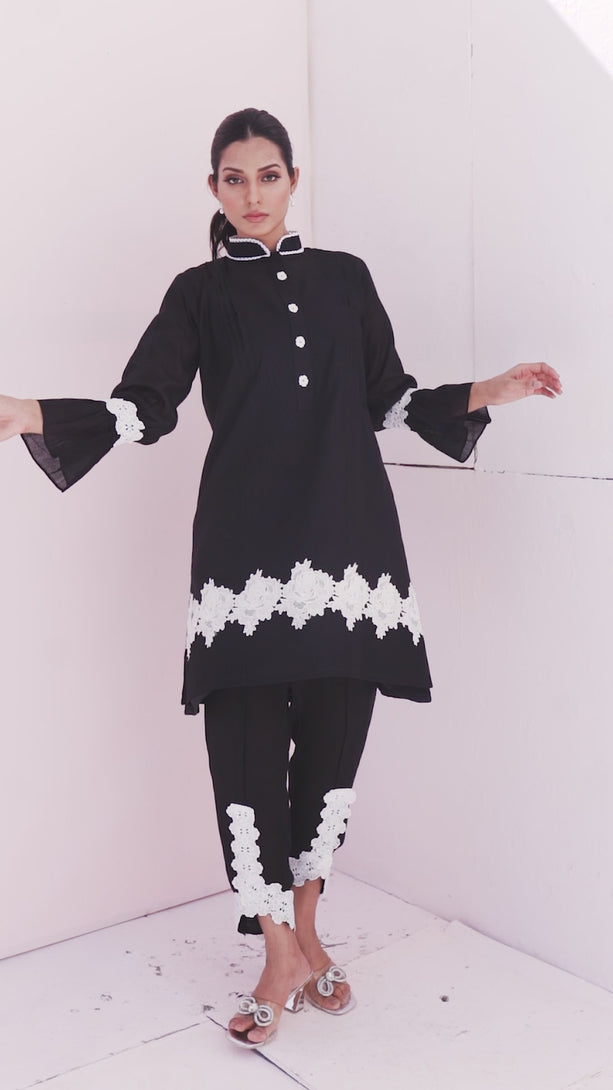 Amp up your style game with our beautifully crafted black soft khaadi silk shirt adorned with floral details. This piece comes with a shamiz.