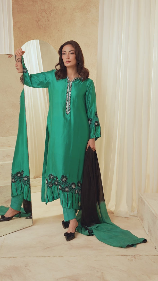 Crafted from pure sea green shisha silk, this dress is a celebration of exquisite artistry. Every detail tells a story, with a symphony of hand-worked crystals, intricate thread work, delicate appliques, lustrous resham, and radiant pearls paired with a silk dupatta. The shimmering fabric reflects the light, while the meticulous embroidery adds a layer of Fineness.