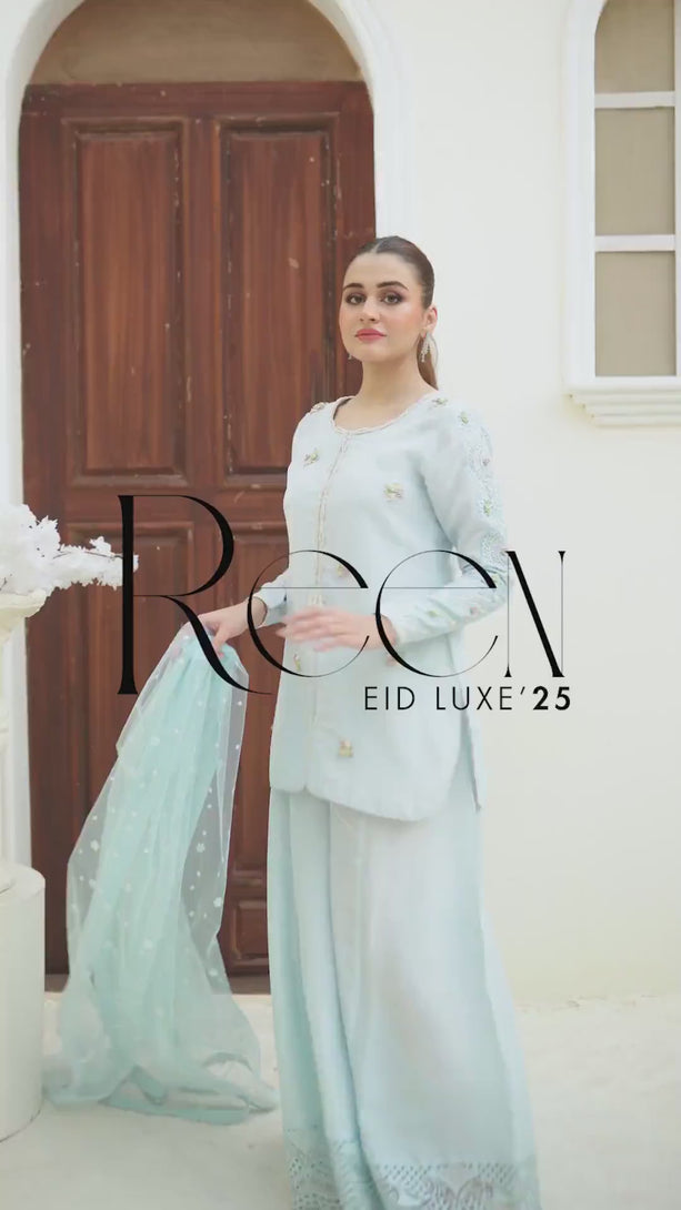 Indulge in elegance with our stunning baby blue ensemble, crafted from luxurious raw silk and adorned with intricate cutwork, signature floral embroidery, and dazzling handworked pearls, crystals, and sequins. The delicate pure soft net dupatta, embellished with floral bootis, adds the perfect touch of ethereal charm, making it an ideal choice for festive celebrations.