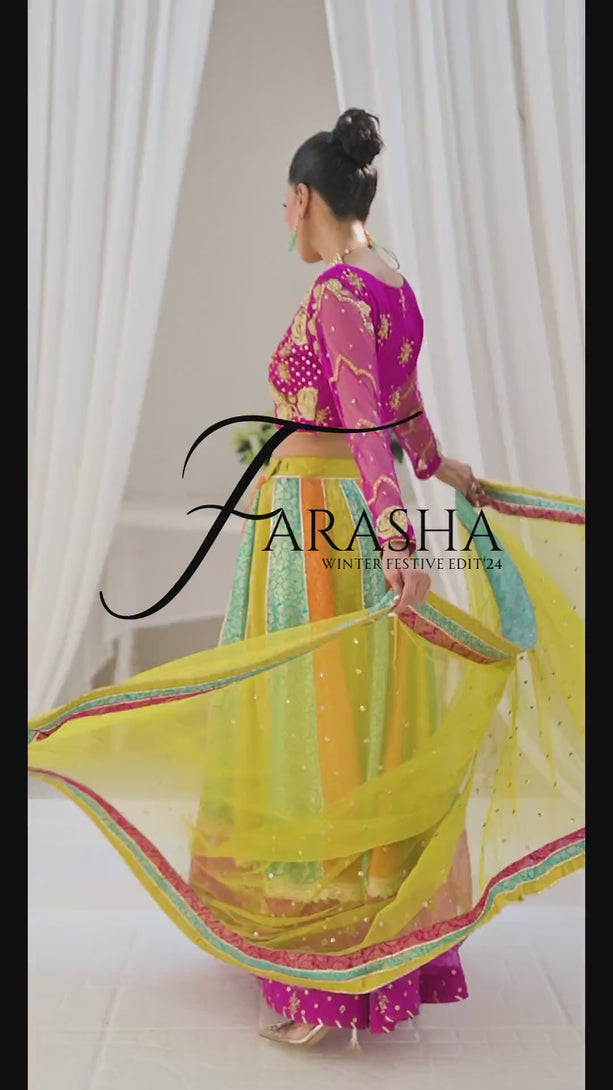Dance in elegance with our multi-hued pure soft net lehenga choli, a vision of grace and grandeur. The flowy jamawar lehenga is adorned with transcendent hand embroidery and shimmering kora work, creating a mesmerizing look. This colorful masterpiece is the perfect choice for the wedding season, exuding sophistication at every twirl.