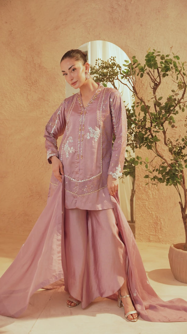 This pure silk stunner in dusty mauve is a vision of grace, with intricate handwork, resham, and shimmering sequins that catch the light with every move. Complemented by a delicate...
