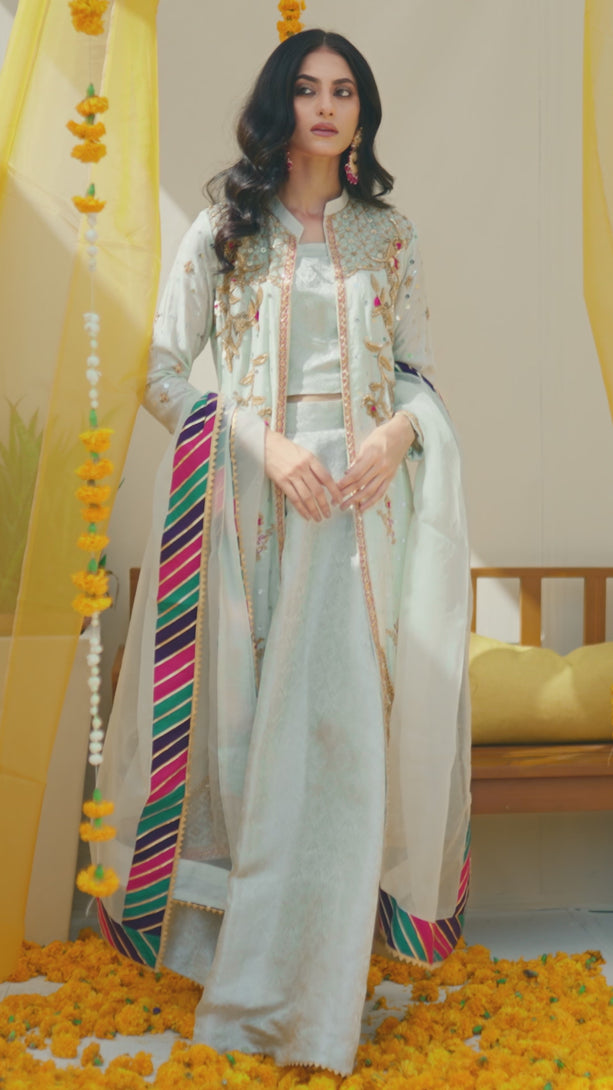 Self-embossed silk fabric with luxurious hand embroidery featuring kora, French knots, tilla, and resham, accentuated with crystals and beads. The elegant color palette makes this ensemble perfect for any occasion.