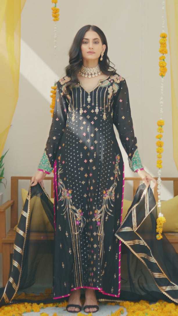 Long A-line ensemble crafted from soft pure khaddi fabric, featuring single resham handwork with sequins, crystals, tilla, and kora. The intricate applique and French knot work add a modern touch...