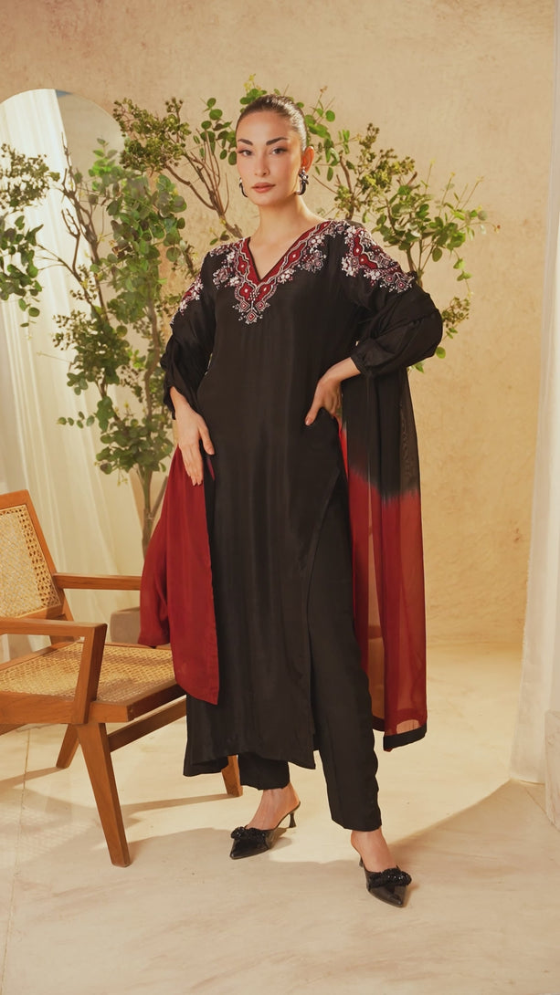 This stunning black and maroon ensemble, crafted from pure butter silk, feels as luxurious as it looks. The shirt is hand-embellished with an array of appliqués, sequins, crystals, resham, and pearls. Paired with a two-toned pure silk dupatta that drapes beautifully, adding a graceful contrast and flow, and finely stitched pants. Lining included